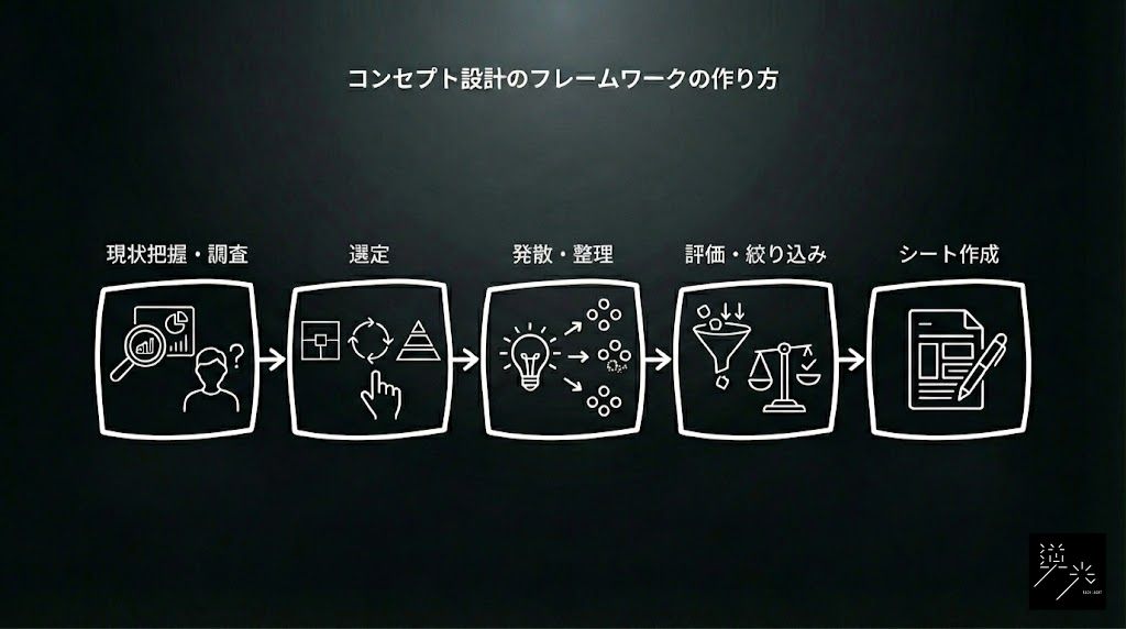 コンセプト設計のプロセスは、現状把握から始まり、フレームワークの選定、アイデアの発散と絞り込み、そしてコンセプトシートへの落とし込みという一連の流れで進みます。